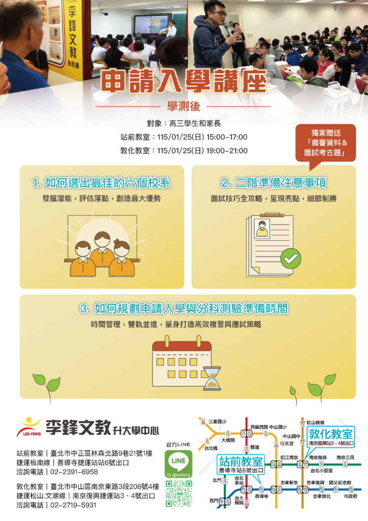 115學測後申請入學講座最新消息 🔍點我諮詢正式課程 學測後申請入學講座 適合:應屆高三生日期:1/25站前+1/25敦化 僅此兩場 五大主題1.學測後的下一步?2.各校系落點分數如何解讀?3.如何選出六個最佳校系?4.準備二階+備審資料的方法為何?5.為何必須準備分科測驗? 報名連結https://www.surveycake.com/s/gwxAA 學測後 分科測驗班 報名中 https://www.lfntu.com/c32/