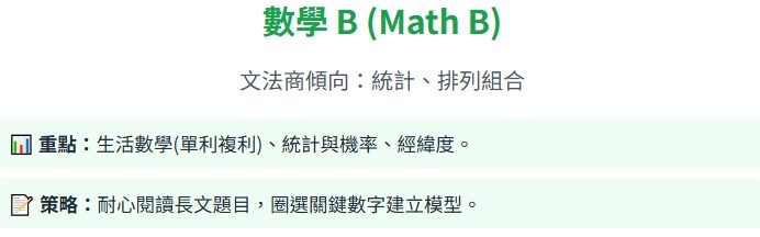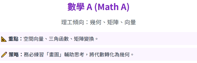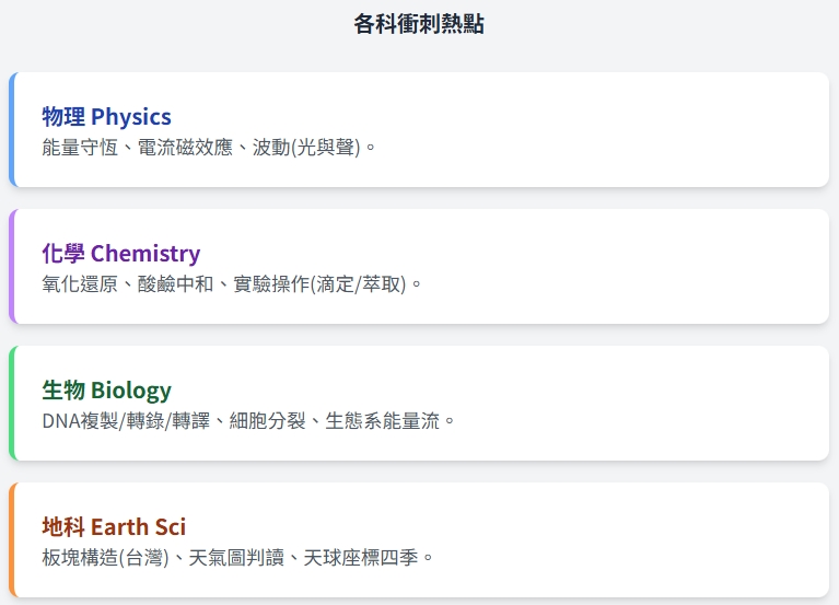115學測考前衝刺總複習學習資源 🔍點我諮詢正式課程 高三生必備攻略:掌握命題趨勢,贏在起跑點 第一篇:國文考科 (Chinese) 閱讀量的大戰:素養與邏輯的對決 近年國文試卷字數破萬,核心在於「混合題型」與「雙文本對讀」。不再死背國學常識,而是將15篇核心古文作為基底,應用於現代議題分析。掌握「閱讀理解層次」是得分關鍵。 古文15篇:畫出文章心智圖,理解論證邏輯。混合題型:結合選擇與簡答,精確擷取資訊。國寫技巧:知性題重邏輯數據,情意題重個人生命故事。 第二篇:英文考科 語境應用與精確輸出 詞彙難度穩定,但題幹變長,重視「搭配詞」(Collocation) 與「篇章結構」。作文近年常考圖片說故事或雙圖比較,要求客觀描述與主觀看法的結合。 閱讀技巧Skimming: 掃描首尾段掌握大意。Scanning: 找關鍵字(人名/數字)定位答案。非選題攻略中譯英: 注意時態與S+V+O結構。作文: 善用轉折詞 (However, Furthermore)。 第三篇:數學考科 (Math A & B) 數A重視空間幾何與抽象思考,數B強調生活應用與數據解讀。切勿盲目刷題,觀念釐清才是王道。 詞彙難度穩定,但題幹變長,重視「搭配詞」(Collocation) 與「篇章結構」。作文近年常考圖片說故事或雙圖比較,要求客觀描述與主觀看法的結合。 第四篇:自然考科 探究與實作:圖表判讀是核心 圖表題佔比超過 60%。物理重觀念少計算,化學重實驗細節,生物重跨科閱讀,地科結合台灣在地特色。 第五篇:社會考科 整合思維與時事連結 歷史略古詳今,地理重GIS與地圖判讀,公民重法律與經濟邏輯。準備時應打破冊別,進行「主題式複習」。 邁向高中一路領先的必勝攻略 高三學測衝刺班 李鋒文教四大支援幫助考生最後衝刺畢業學長姐真心推薦 瞭解更多 學測後 申請入學講座 五大主題1.學測後的下一步?2.各校系落點分數如何解讀?3.如何選出六個最佳校系?4.準備二階+備審資料的方法為何?5.為何必須準備分科測驗? 瞭解更多 高三春季—分科進度班 高三下學期,是升學最後一哩路。根據過往經驗,能在學測後持續備戰分科測驗的學生,通常表現更穩定、志願選填更有彈性,最終進入理想校系機會也顯著提高。 瞭解更多 加入李鋒文教 LINE 官方帳號 透過 LINE 隨時諮詢 掌握最新升學資訊 加入好友 立即預約諮詢 想了解課程或報名資訊即刻填寫預約諮詢表單我們會盡快與您聯繫! 預約諮詢
