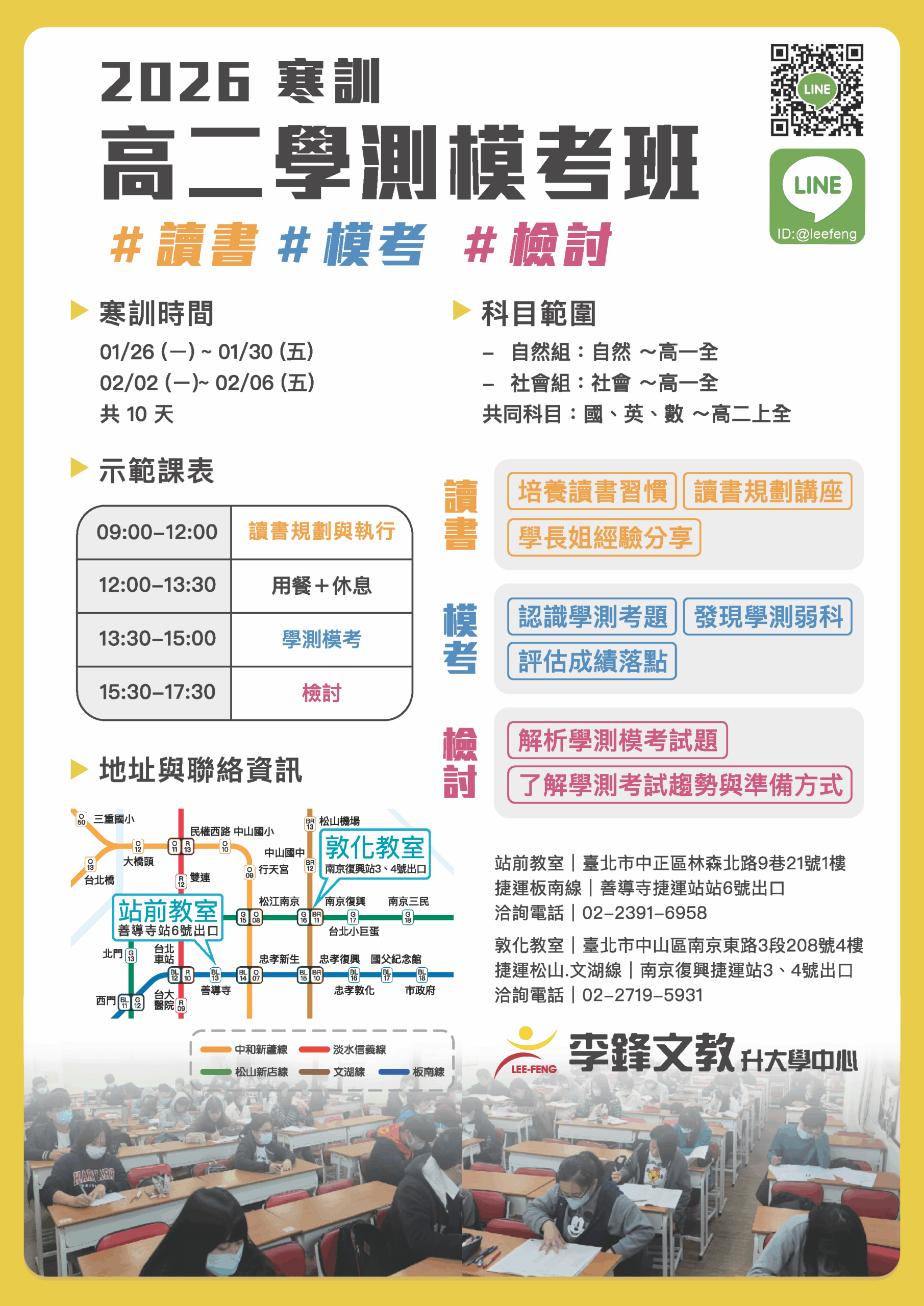 2026高二學測模考班學測全科班, 課程介紹, 高二課程 🔍點我諮詢正式課程 高二寒假八天學測模考班製作讀書規劃體驗學測考題掌握大考趨勢規劃寒訓時間名額限定班內生優先報名 2025征戰學測白皮書剖析大考趨勢與準備學測規劃+學測全科班規劃分享給高二學子與家長https://www.lfntu.com/2025withepaper/ 台大電機校友主持歷屆學生表現傑出北市家長口碑推薦