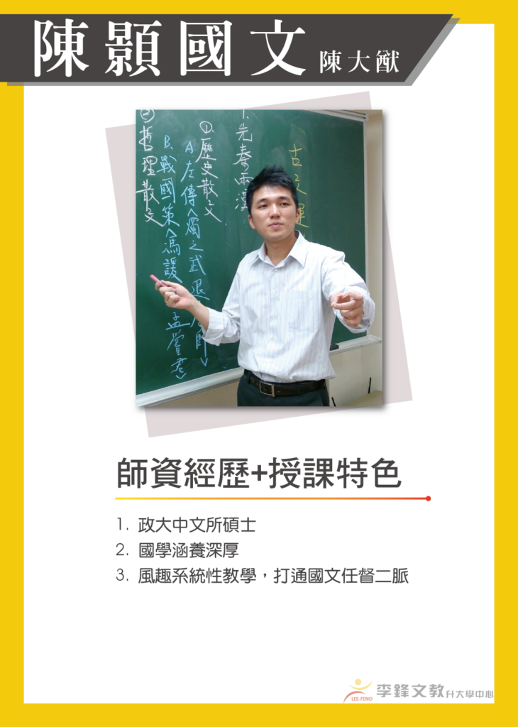 陳顥老師是我看過最理性的國文老師,從作文理性題或是選擇題的講解,到講義的編排分類老師都很有條理晰。學生無論是聽講或是閱讀,只要好好跟著老師的腳步,基本上一定能理解。
