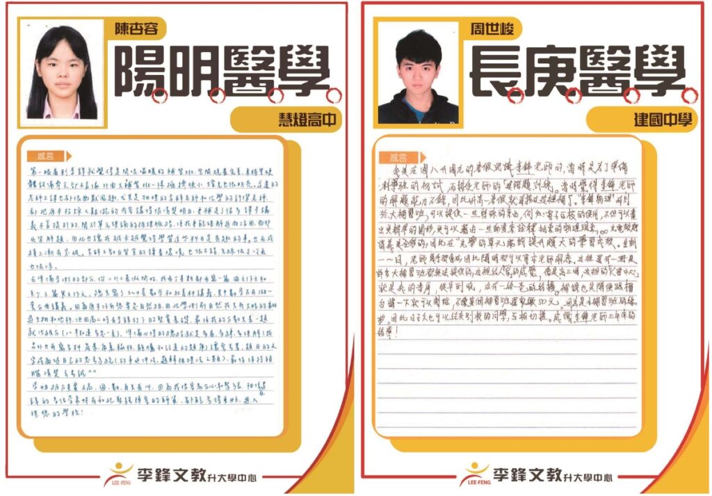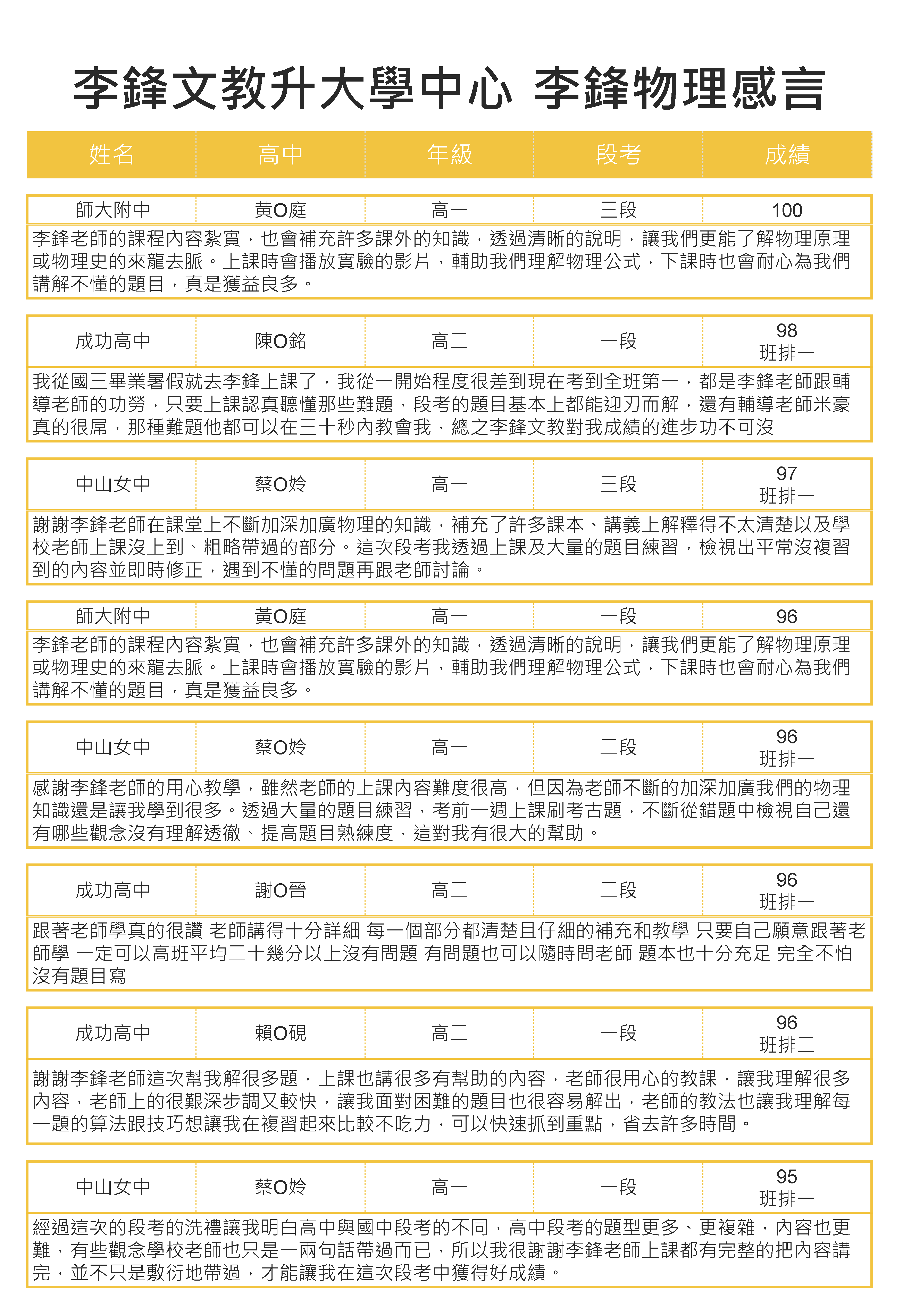 李鋒物理師資介紹 李鋒物理 開課介紹 學習好物理需要三個正確態度:第一:上課專注聆聽+動腦思考。第二:回家準時複習觀念後做題目,不拖延。第三:持續上面兩個態度。 高一物理 ⭕上課堂數:暑假5堂課1堂模考⭕課程特色:建立高一物理重要學習方式與態度⭕能力養成:訓練學生運動學與高一力學基礎能力⭕預設目標:開學後的段考成績比班平均高10分 瞭解更多 高二物理 ⭕上課堂數l:暑秋24堂課 春季24堂課⭕進班標準:需經過授課老師審核才能進班⭕課程特色:上課節奏快.內容深.廣.補充題多⭕能力養成:能面對與戰勝高中物理高強度變化型考題⭕預設目標:段考成績比班平均高20分 瞭解更多 學測物理 ⭕上課堂數:8堂複習+3堂素養訓練⭕課程特色:跨章節統整觀念->挑戰素養題型⭕能力養成:面對新考題可以在有限時間內精準完成作答⭕預設目標: 90%以上答對率 瞭解更多 成功高中 陳彥圻 錄取 陽明醫科 113 申請金榜 在高二下學期,我來到李鋒文教補習英文與物理,後來也報名了化學科。很感謝李鋒文教,讓我在大考有穩定的表現 ⋯⋯ 李鋒物理提升了我對選修物理的掌握。高一時的物理偏記憶,我處理起來得心應手,但升上高二後,選物繁瑣的計算讓我漸漸無法處理。李鋒老師對觀念整理很清楚,會明確指出需要熟記的內容,講解題目也很有條理與一致性。課後的練習題由李鋒老師驗收,很能起到複習和記憶鞏固的作用,也能改進手寫過程的缺點。來到李鋒物理,我從此不再害怕段考的物理計算題,反而能用物理難題與同學拉開分數差距。 成功高中 鐘紹桓 錄取 中國醫牙醫系 113 申請金榜 在我收到大學錄取通知的那一刻,心中充滿了激動與感激。這一切的成功,無疑是老師們辛勤付出的結果。在此,我特別想對李鋒文教表達我深深的感謝 ⋯⋯ 關於物理學科,李鋒老師的教學更是給予了我無比寶貴的知識和經驗。您總是以實驗和實踐為重點,讓我在探索物理現象的過程中,既掌握了基礎知識,又激發了對科學的濃厚興趣。每一次的實驗和問題解答,您都耐心指導,讓我對物理的理解不斷加深,也讓我在這門學科上建立了堅實的基礎。 北一女中 陳加恩 錄取 北醫藥學系 113 申請金榜 當我進入高二後,理科的難度急遽提升,特別是物理這門學科成為了我心中的絆腳石。 ⋯⋯ 儘管我曾報名知名的補習班,但成績卻沒有明顯改善,直到我轉換到李鋒文教,才漸漸找到了學習物理的方法。李鋒老師常以動畫和實驗來闡述概念,不僅使課堂生動有趣,同時建立清晰的知識架構。在講解完概念後,我們會進行題目實戰演練,老師會解釋解題步驟和思維過程,幫助我抓住考試的重點和自己的盲點。除了課堂習題,老師還會挑選相似的題目,在下課前給我們時間練習,並安排多位輔導老師巡堂,隨時解答疑問。 師大附中 邵愷信 錄取 台大資工 112 分發金榜 我畢業於師大附中,應屆分科測驗錄取台大資工系。從高二下學期,我開始在李鋒文教補習物理、數學 ⋯⋯ 李鋒老師上課時總是會把細節解釋清楚,不講求快速的推進進度,而重視我們是否對課程內容確實理解。令我印象最深刻的是,下課前老師會從當天的上課內容中挑出幾題讓我們完成,由李鋒老師親自驗收。這對當時我來說是不小的壓力,我總是待到最後才離開教室。但是,這個做法改變了我的讀書習慣,原本我上課時經常埋頭抄筆記,疏於理解課程的內容,這樣非常沒有效率,使我需要付出更多的時間。課後因為必須解出幾道題目,驅使我在課堂上更專注於理解,養成先聽內容再抄筆記的習慣,這對我的幫助不僅止表現於物理科,也影響了其他科目的表現。